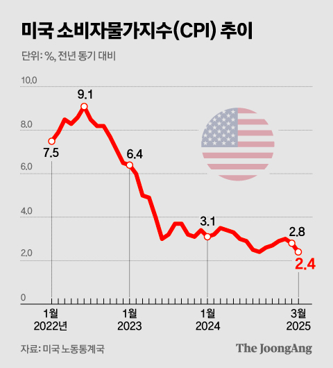 트럼프 대통령의 상호관세는 향후 물가 향방에 가장 큰 변수다. 중국산 수입품에 미국 정부가 124% 관세 폭탄을 터트리면서, 이달 CPI 집계부터는 수입품 가격이 크게 오를 가능성이 높다. 미국이 수입하는 가구와 의류·전자제품에 중국산은 큰 비중을 차지한다. 사라 하우스 웰스파고 이코노미스트는 “세계 무역 환경의 변화를 고려할 때 관세는 더 빠른 물가 상승으로 이어지기 때문에 3월은 올해 인플레이션의 저점을 기록할 것으로 보인다”고 짚었다.