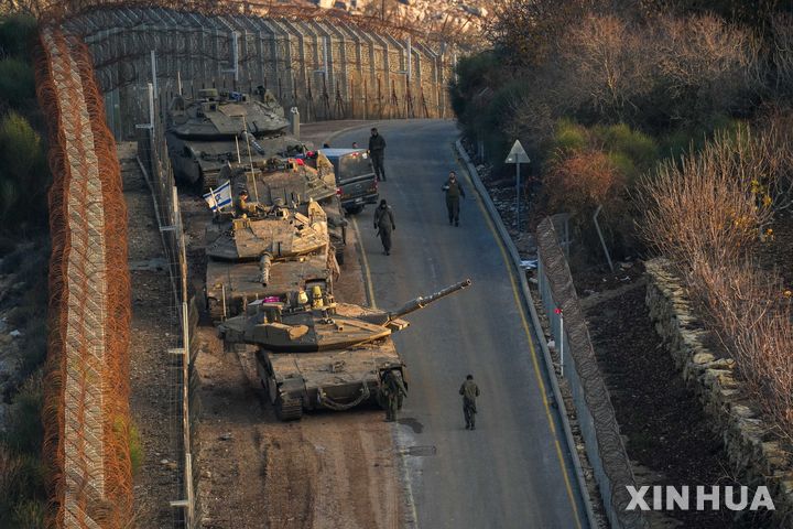 [ 신화/뉴시스] 지난 해 12월 9일 시리아 아사드 정부가 무너진 직후 시리아국경과 골란고원 사이의 완충지대를 재빨리 점령한 이스라엘군 탱크부대. 2025.04.11. |