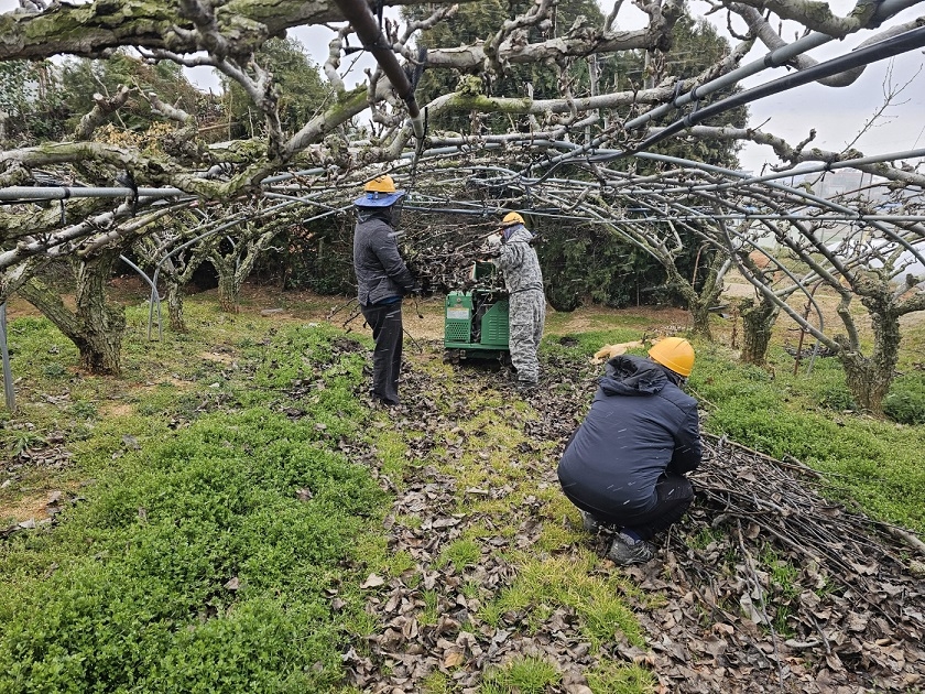 2팀 10명으로 파쇄지원단을 꾸리고 이 지역의 주 농산물인 배, 무화과, 포도 같은 과수 잔가지와 고춧대 등의 영농부산물을 중점적으로 파쇄하고 있다.