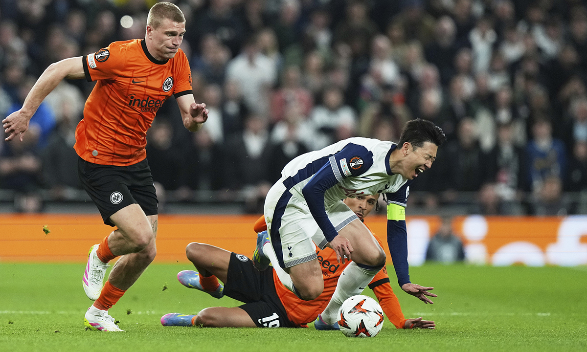 토트넘 손흥민(오른쪽)이 11일 영국 런던의 토트넘 홋스퍼 스타디움에서 열린 2024∼2025 UEL 8강 1차전 아인트라흐트 프랑크푸르트와 경기 중 상대에게 반칙을 당하고 있다. 런던=AP연합뉴스 |