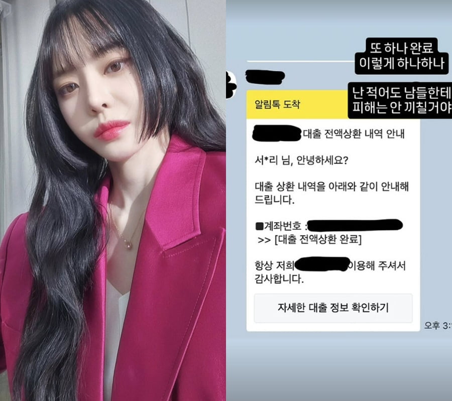 공개된 사진 속에는 서유리가 대출받은 은행에서 알림 메시지가 도착한 모습. 메시지 안에는 "대출 상환 내역을 안내한다"며 서유리가 빌린 돈을 전액 상환했음을 알리고 있다.
