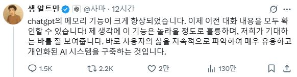 그는 "챗GPT의 메모리를 대폭 향상했다"며 "이제 과거의 모든 대화를 참조할 수 있다"고 강조했다. 이어 "시간이 지날수록 여러분을 점점 더 잘 알게 돼 매우 유용하고 개인화된 AI 시스템이 되는 것"이라고 덧붙였다.