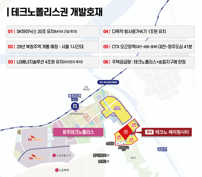 송절지구는 청주 테크노폴리스와 인접한 대규모 도시개발구역으로 총 4700여 세대 규모의 공동주택과 준주거시설이 조성될 예정이다. 특히 SK하이닉스의 20조원에 육박하는 대규모 투자와 북청주역 개통 등 지역 개발 호재가 이어지면서 송절지구는 물론 북청주 전체가 수도권과 충청권을 연결하는 핵심 거점으로 주목받고 있다. 북청주역 개통 시기는 송절1지구 내 첫 주거단지인 '현대테크노 레이원시티' 입주시기와 맞물릴 것으로 예상된다는 것이 관계자의 설명이다.
