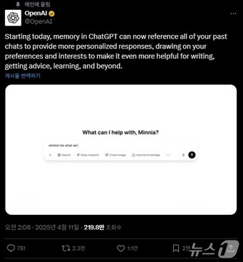 샘 올트먼 오픈AI CEO는 X(옛 트위터)에 메모리 기능 업데이트를 알리며 "챗GPT가 이용자의 삶을 알아가게 될 것"이라며 "매우 유용하고 개인화된 AI 시스템이 되는 것"이라고 말했다.