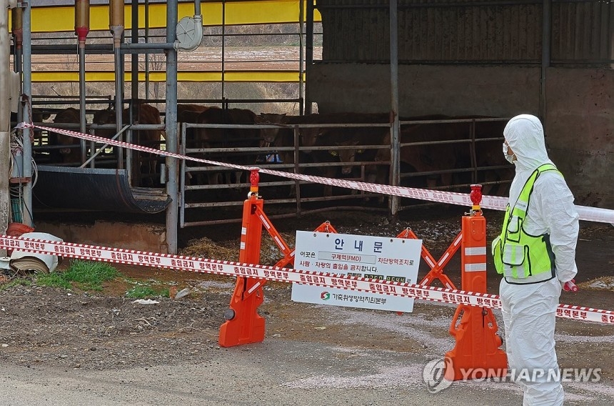 지난달 18일 구제역이 발생한 전남 영암군 한 한우농장 앞에서 방역 당국 관계자가 출입 통제하고 있다. 연합뉴스 |