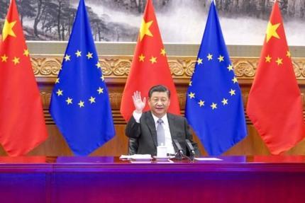 시진핑 중국 국가주석이 2020년 12월 베이징에서 유럽연합(EU) 지도부와 화상회의를 하며 손을 흔들고 있다. 베이징=AP 뉴시스 |