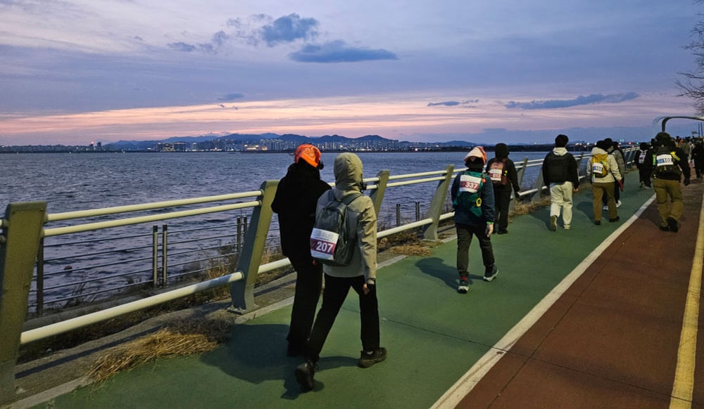 걷기는 극기의 동의어. 2시간쯤 지나자, 대퇴부가 뻐근해졌다. 재잘대던 사람들이 점차 침묵의 현자가 돼갔다. 경로를 이탈해 인근 커피숍으로 향하는 무리도 포착됐다. 게다가 별스럽게 추운 날이었다. 수도권에는 난데없는 눈까지 내렸다. 쉴 새 없는 맞바람에 골이 띵했고, 낙조정 잔디밭에서 야외 석식을 먹고 나서는 체감 기온이 영하로 떨어졌다. 걷기는 경쟁과 무관하다. 완보냐 아니냐, 그뿐. 그러나 본 기자는 이 와중에도, 이왕 왔는데, 선두권으로 골인해야 한다는 좀스러운 강박에 시달리고 있었다.