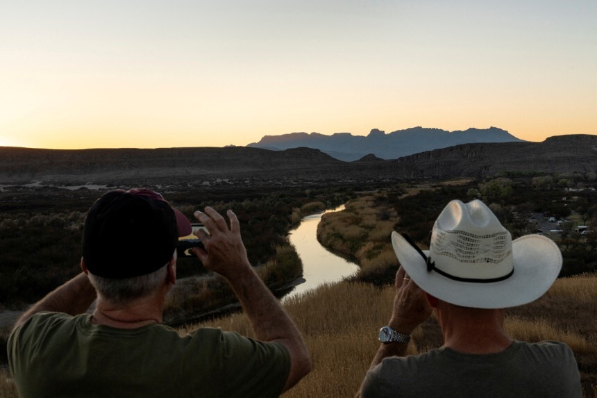 지난달 23일(현지시간) 미국 텍사스주 빅벤드 국립공원에서 방문객들이 리오그란데 강의 사진을 찍고 있다. 로이터=연합 |
