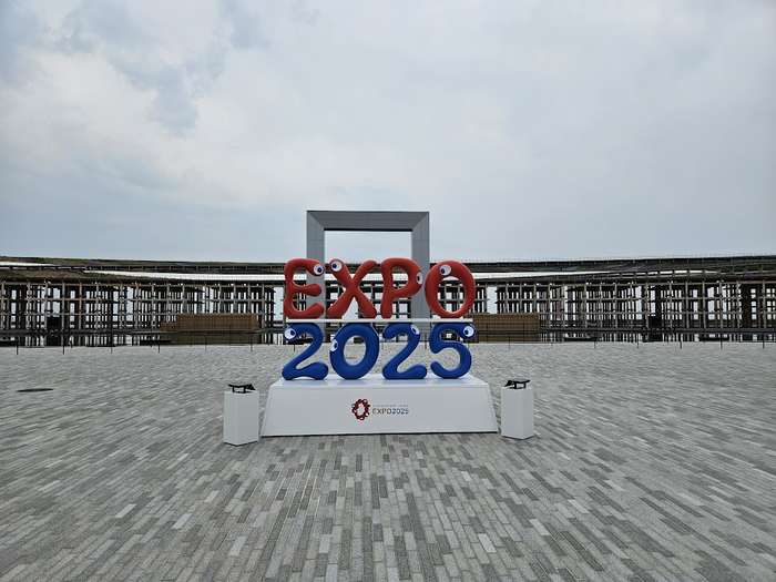 워터플라자 앞에 서 있는 엑스포2025 조형물. 뒤로 분수쇼가 펼쳐지는 오브제와 그랜드링의 모습이 보인다. [도쿄 = 이승훈 특파원] |
