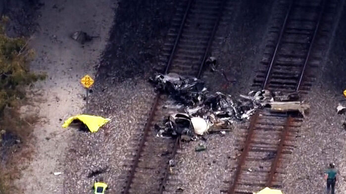 철로 위 소형 비행기가 부서지고 불에 타 형체를 알아볼 수 없게 변했습니다.