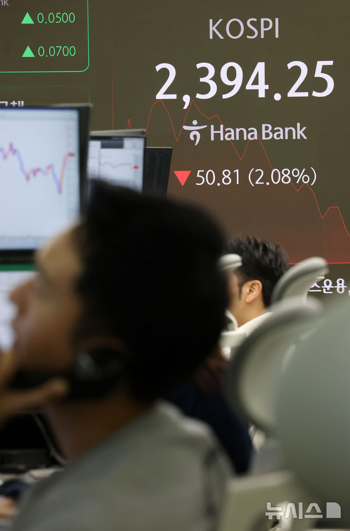 [서울=뉴시스] 홍효식 기자 = 코스피가 전 거래일(2445.06)보다 44.32포인트(1.81%) 내린 2400.74에 개장한 11일 오전 서울 중구 하나은행 딜링룸 전광판에 지수가 표시되고 있다.코스닥 지수는 전 거래일(681.79)보다 8.70포인트(1.28%) 하락한 673.09에 거래를 시작했다. 서울 외환시장에서 원·달러 환율은 전 거래일 주간거래 종가(1456.4원)보다 2.4원 내린 1454.0원에 출발했다. 2025.04.11. yesphoto@newsis.com |