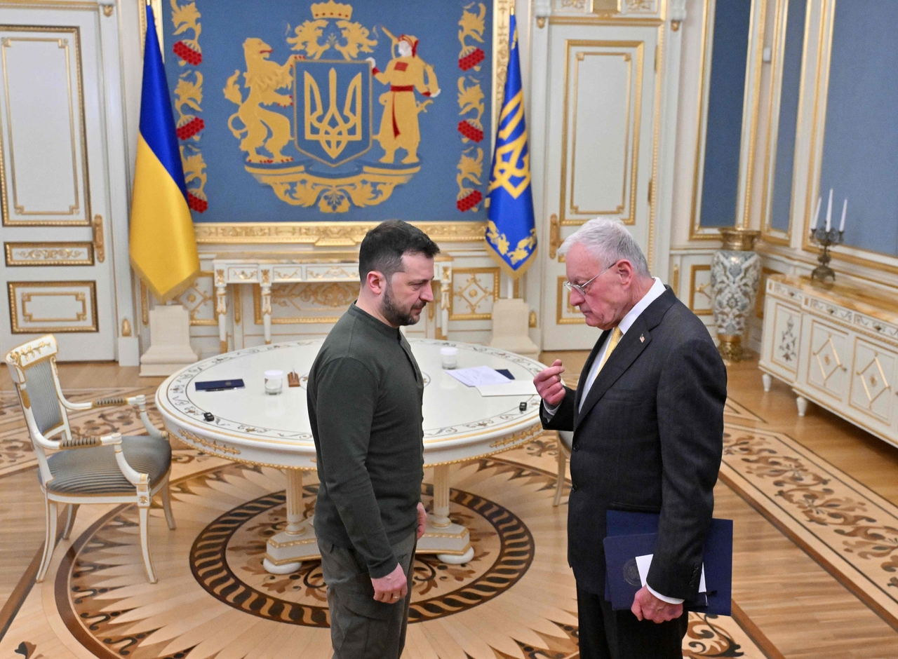 볼로디미르 젤렌스키 우크라이나 대통령이 20일(현지시간) 키이우 대통령궁을 방문한 키스 켈로그 미 우크라이나·러시아 특사와 만나 이야기하고 있다. [AFP] |