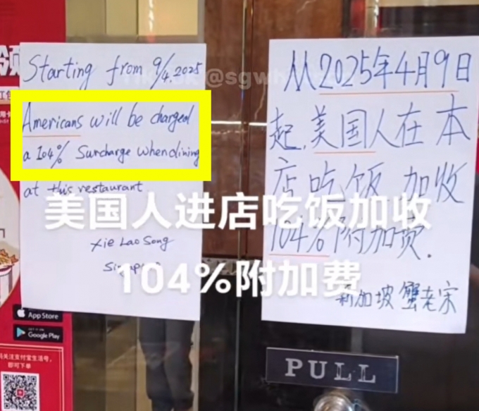 싱가포르 차이나타운의 한 식당에는 "2025년 4월 9일부터 미국인은 이 레스토랑에서 식사할 경우 104%의 추가 요금을 부과받는다"는 안내문이 내걸렸다. 틱톡에 올라온 영상에는 이러한 내용의 안내문이 붙은 식당 모습이 담겼다. 현재까지 60만 회 이상의 조회수를 기록하고 2400개 이상의 댓글이 달리는 등 이 식당의 안내문이 온라인 상에 빠르게 퍼지자 식당 주인은 안내문을 내렸다.
