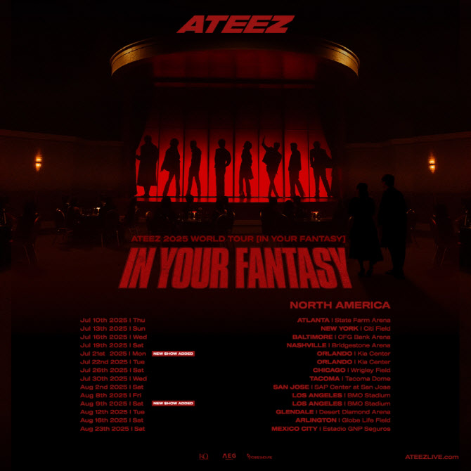소속사 KQ엔터테인먼트는 지난 11일 ‘에이티즈 2025 월드 투어 ’인 유어 판타지‘(ATEEZ 2025 WORLD TOUR ’IN YOUR FANTASY‘)’ 북미 공연 회차 추가 소식을 알렸다.