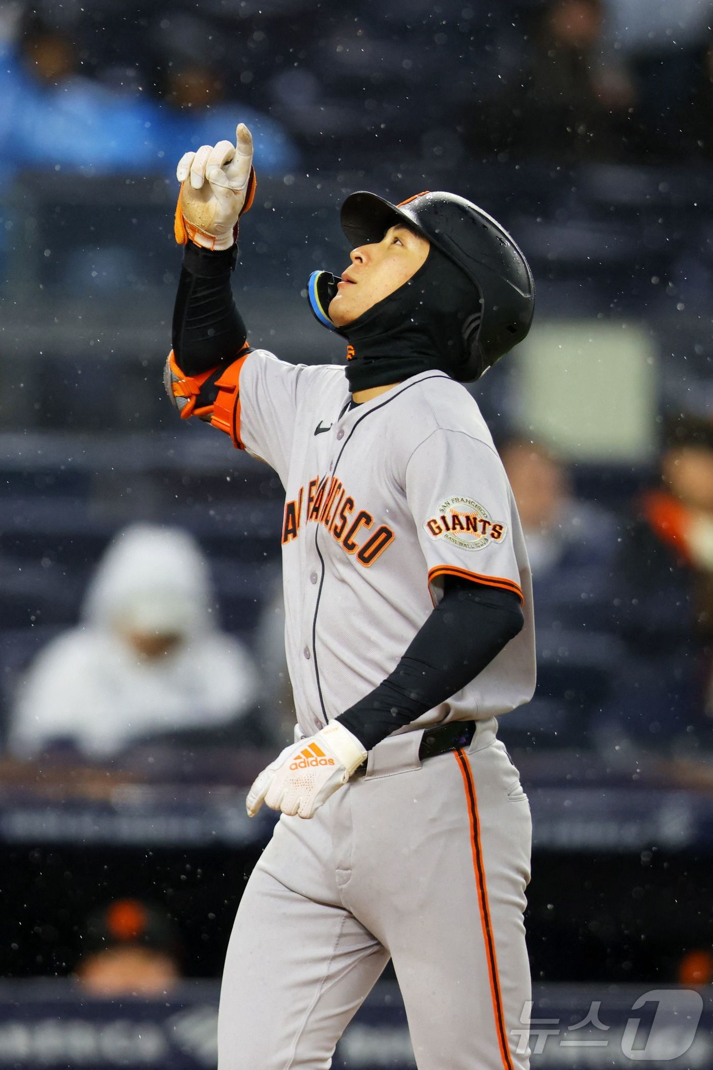 샌프란시스코 이정후가 12일(한국시간) 뉴욕 양키스전에서 홈런을 친 뒤 세리머니를 하고 있다. ⓒ AFP=뉴스1 |