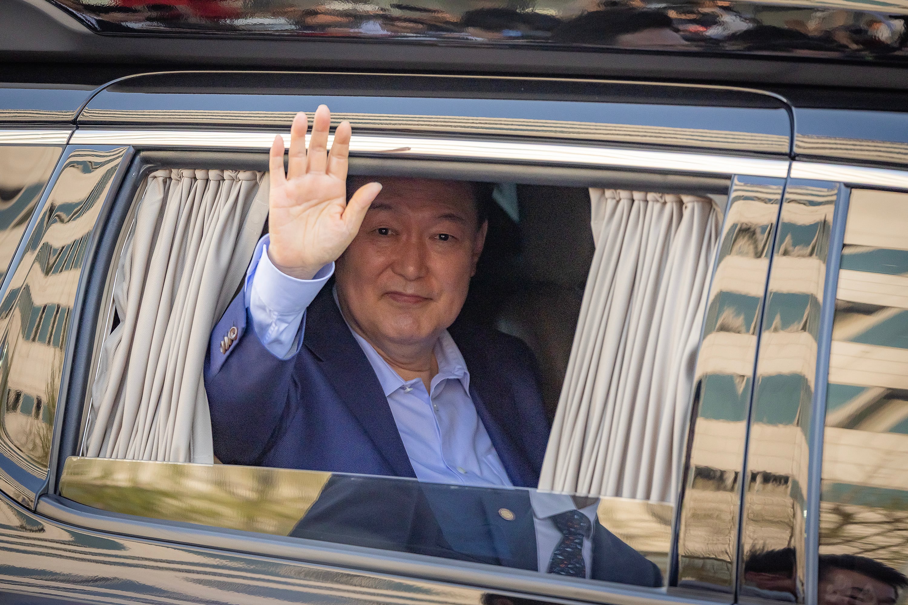 윤석열 전 대통령이 11일 오후 서울 한남동 관저를 나가면서 지지자들을 향해 손을 흔들고 있다. /김지호 기자 |