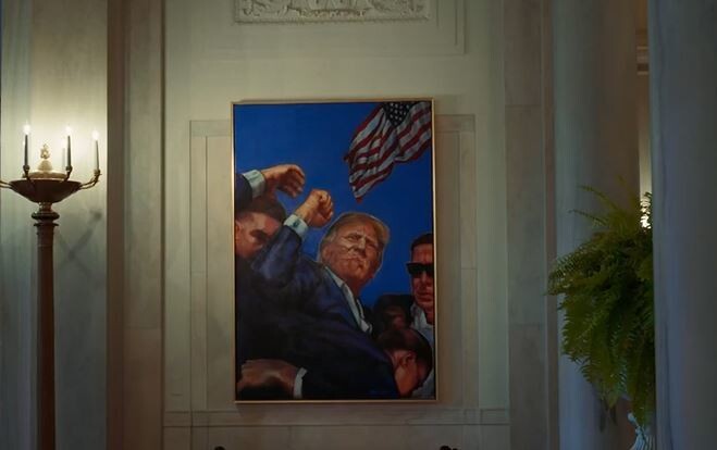 백악관은 12일 스테이트 플로어의 현관 벽에 건 그림을 ‘백악관의 새 작품’이라는 제목을 달아 소셜미디어로 공개했다. 이 그림은 일반적 초상화가 아니라 트럼프가 지난해 7월 펜실베이니아주 버틀러에서 대선 유세 중 총격으로 귓볼에서 피를 흘리면서 주먹을 흔드는 장면을 담았다. 그림의 소재는 당시 에이피(AP) 통신 기자가 촬영한 유명한 사진이다. 총격을 받고서도 “싸우자”는 구호를 외쳤다는 얘기와 함께 유권자들에게 강한 인상을 남겨 선거에 도움이 됐다는 평가가 나온 바로 그 사진이다.