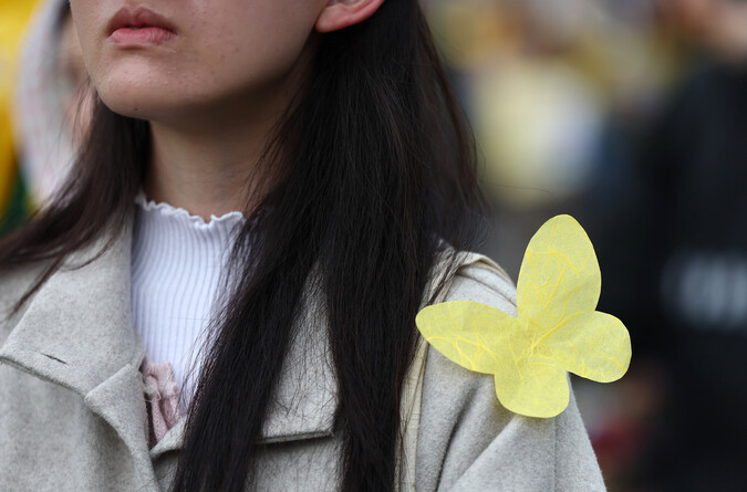 12일 오후 서울 경복궁 인근에서 열린 ‘4.16세월호 참사 11주기 기억약속 시민대회’에서 참석자 어깨에 나비 모양 장식물이 부착돼 있다. 연합뉴스 |
