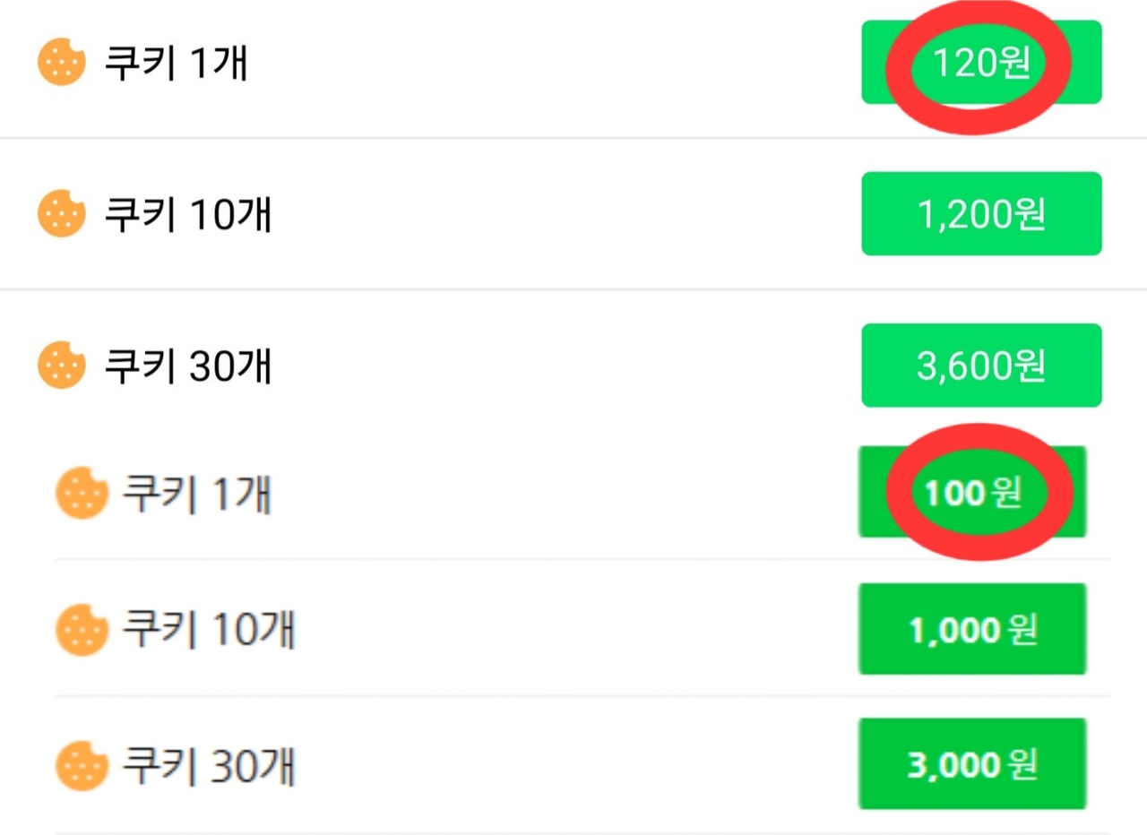 네이버웹툰에서 판매하는 쿠키 가격. 웹사이트(하단)에서는 개당 100원에 구매할 수 있는 반면, 앱(상단)에서 구매할 경우 수수료가 더해저 개당 120원에 구매야해 한다. [네이버 웹사이트, 네이버 웹툰 앱 갈무리] |