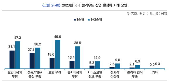 국내 클라우드 서비스를 공급하는 2389개 기업 중 730개 기업을 대상으로 실시한 이번 조사에서 기업들은 클라우드 산업 활성화를 저해하는 요인으로 ‘보안 우려’(49.6%)를 가장 많이 꼽았다. 1순위 응답만 보면 도입비용 부담(31.1%)과 성능·기능·품질 부족(27.1%)에 이어 보안 우려(18.6%)가 3위였지만 1·2순위 응답을 합산한 결과에서는 보안 우려가 전체의 절반에 가까운 49.6%로 집계됐다.