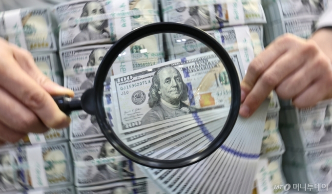 (서울=뉴스1) 김도우 기자 = 원달러 환율이 2009년 금융위기 이후 최고치를 보이고 있는 1일 서울 중구 하나은행 위변조대응센터에서 직원이 달러 지폐를 살펴보고 있다. 한편, 외환 당국이 지난해 외환 시장 안정을 위해 112억 달러 규모의 외화를 내다 판 것으로 나타났다. 2025.4.1/뉴스1 Copyright (C) 뉴스1. All rights reserved. 무단 전재 및 재배포, AI학습 이용 금지. /사진=(서울=뉴스1) 김도우 기자 |