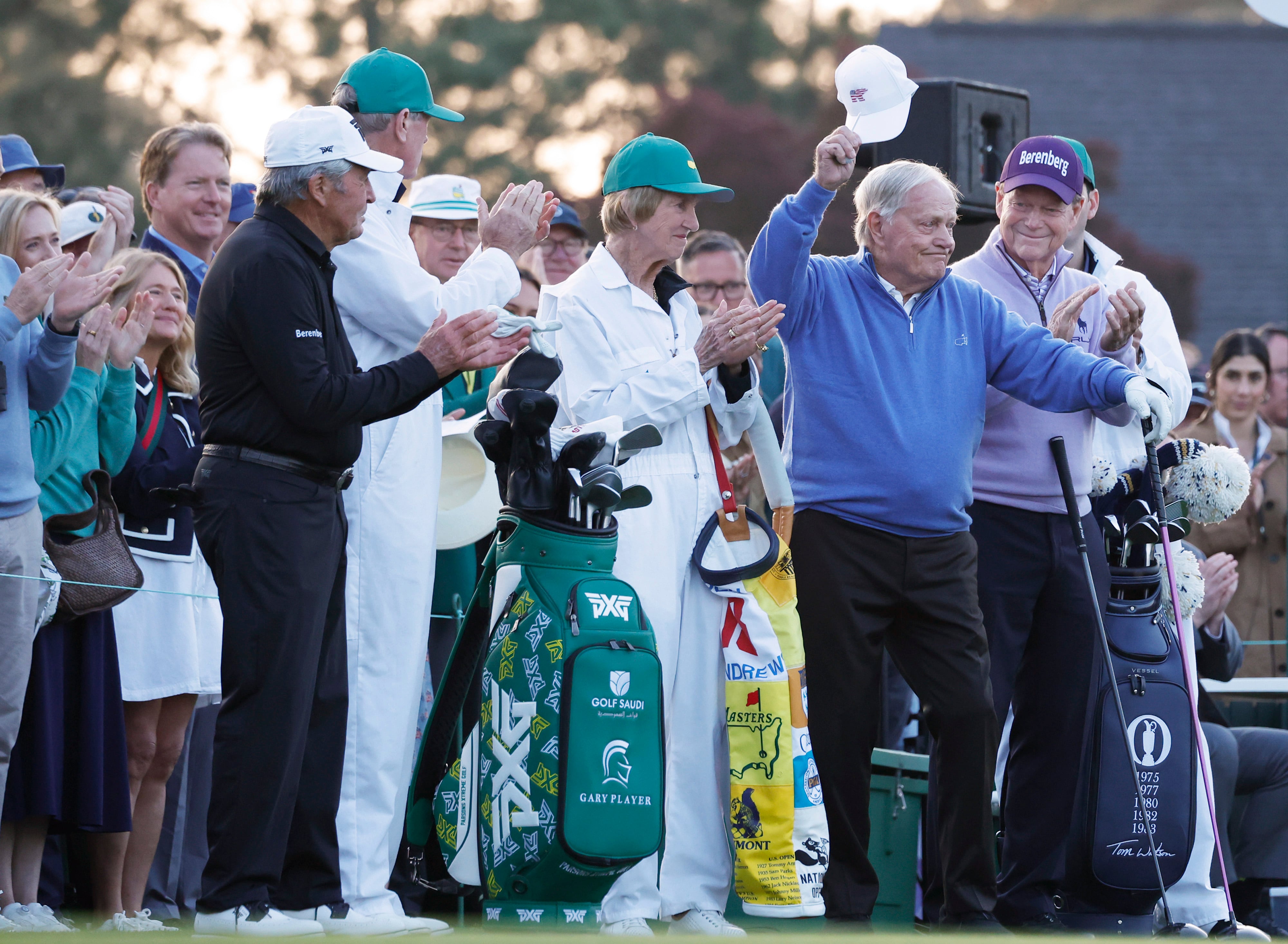 마스터스는 1라운드 시작에 앞서 마스터스 우승 경험이 있는 골프의 전설들이 시타를 하는 명예 시타제를 운영한다. 2025 마스터스에서는 잭 니클라우스, 게리 플레이어, 톰 왓슨이 참가했다./UPI 연합뉴스 |