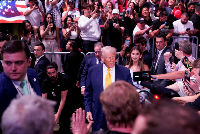 도널드 트럼프 미국 대통령이 12일(현지시간) 미국 플로리다주 마이애미 카세야 센터에서 열린 UFC 314 경기장에 들어서고 있다./로이터 연합 |