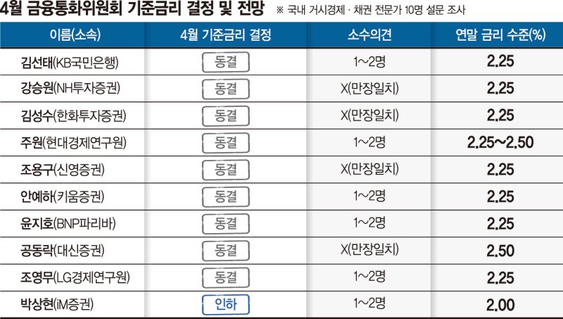 파이낸셜뉴스가 13일 국내 거시경제·채권 전문가 10명을 대상으로 조사한 결과 이들 가운데 9명은 금통위가 기준금리를 동결할 것으로 예측했다. 지난 2월 2%대에 진입한 뒤 연 2.75%로 묶이는 셈이다.