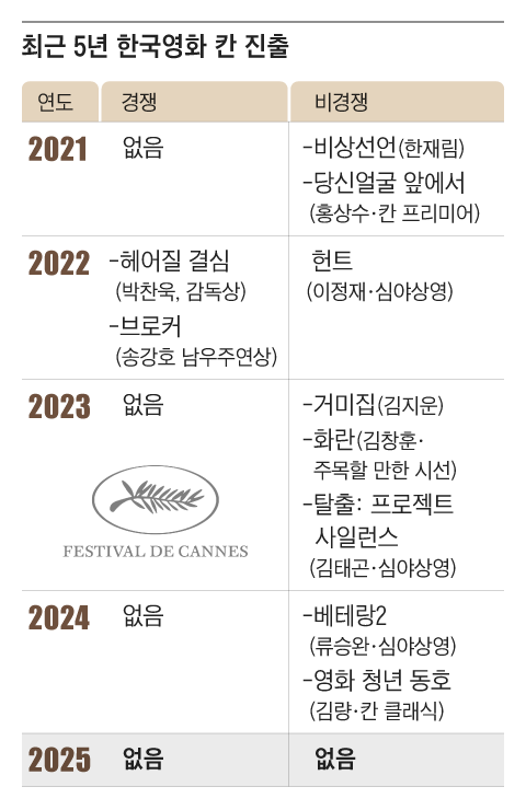 칸의 싸늘한 성적표를 받아든 영화계는 올 것이 왔다는 반응이다. 본지가 전문가 11인에게 설문한 결과, “수년간 누적된 문제점이 수면 위로 드러난 사건”이라는 의견이 대부분이었다. 국내 대표 투자배급사인 CJ ENM만 봐도 확연하다. 영화 ‘기생충’과 ‘헤어질 결심’ 투자배급사로 한국 영화 글로벌 진출에 앞장섰던 CJ ENM은 올해 칸 출품작을 못 냈을 뿐 아니라 해외 바이어를 불러 모을 부스조차 못 차릴 형편이다. “판매할 영화가 없기 때문”이다.