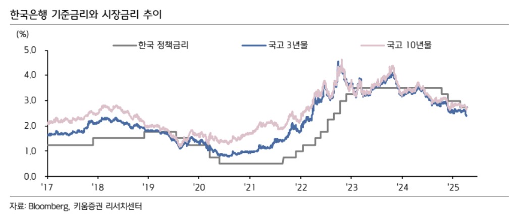 이를 감안해 금통위는 5월 성장률 하향 조정과 함께 금리 인하를 단행할 것으로 예상했다. 안 연구원은 무역정책 불확실성이 예상보다 장기화할 수 있다는 점에서 한국은행의 금리 인하 기조가 5월과 8월까지 이어질 것으로 봤다.