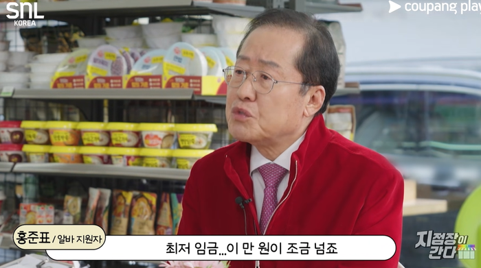 홍준표 전 대구광역시장이 SNL에 출연했다. 최저임금이 얼마냐고 묻는 질문에 ‘만원이 조금 넘는다’고 답했다. [사진 출처 = 쿠팡플레이] |