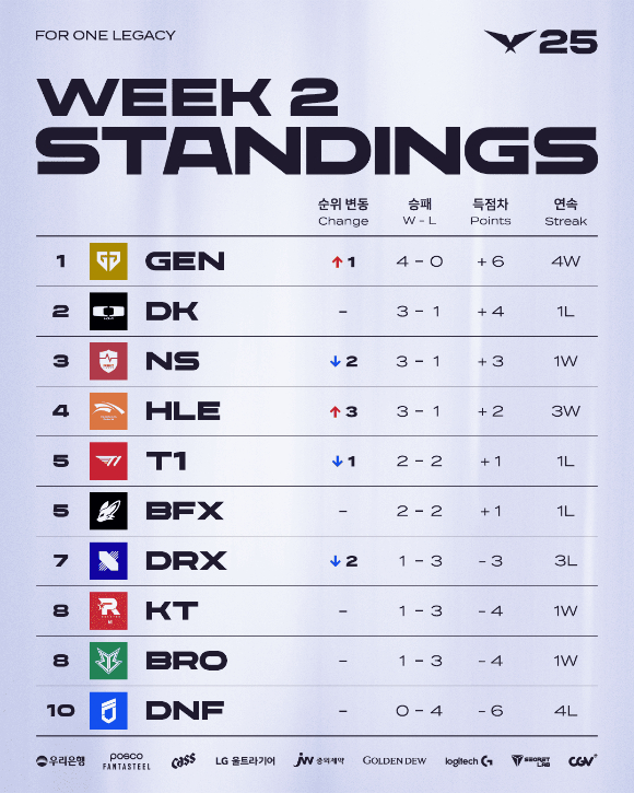 2024 LCK 서머 우승 이후 2025년 LCK컵과 국제 대회인 퍼스트 스탠드를 연이어 제패한 '디펜딩 챔피언' 한화생명e스포츠도 2주 차에서 DN 프릭스와 T1을 무너뜨리며 연승 가도를 이어갔다. 9일 DN 프릭스를 맞아 한 세트를 내주며 불안한 모습을 보였던 한화생명e스포츠는 3세트에서 미드 라이너 '제카' 김건우가 아칼리를 선택, 15킬을 달성하면서 승리를 굳혔다.