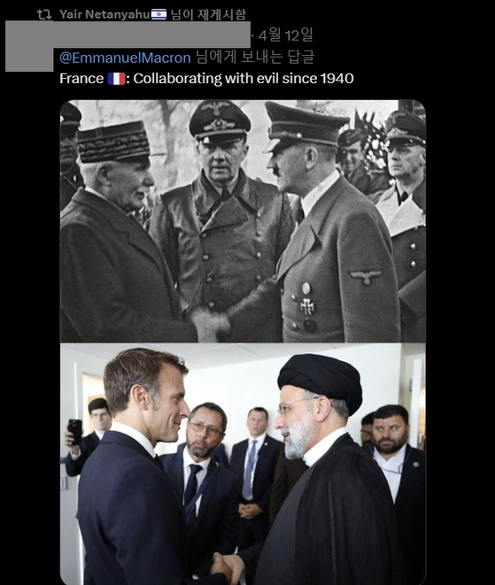 야이르 네타냐후가 X에서 공유한 한 네티즌의 글. 사진에서 마크롱 대통령이 하산 로하니 전 이란 대통령과 악수하는 장면(아래)을, 필리프 페탱 전 프랑스 총리가 아돌프 히틀러와 악수하는 장면과 나란히 배치한 사진. 사진 X 캡처 |