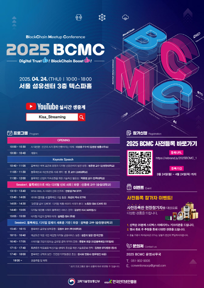 올해는 ‘Digital Trust Up! BlockChain Boost Up!’을 주제로, 기술 현황 공유와 미래 발전 방향 논의에 집중한다.