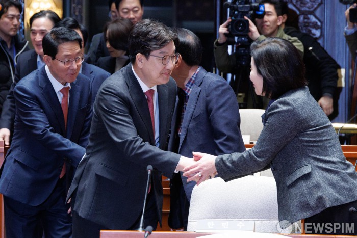 [서울=뉴스핌] 윤창빈 기자 = 권성동 국민의힘 원내대표가 14일 오후 서울 여의도 국회에서 열린 의원총회에 참석하고 있다. 2025.04.14 pangbin@newspim.com