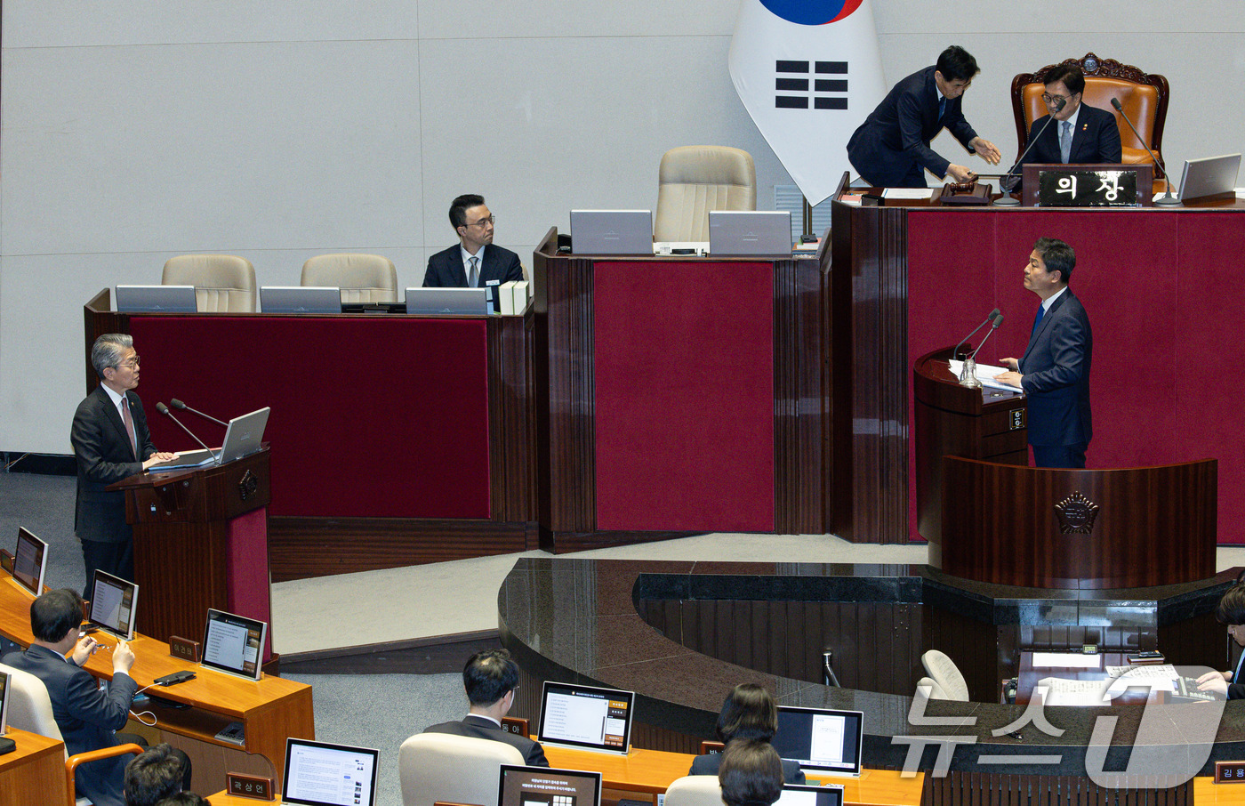 (서울=뉴스1) 이재명 기자 = 김홍균 외교부 제1차관이 14일 오후 서울 여의도 국회에서 열린 제424회 국회(임시회) 제2차 본회의에서 김영배 더불어민주당 의원의 정치·외교·통일·안보에 관한 질문에 답변하고 있다. 2025.4.14/뉴스1