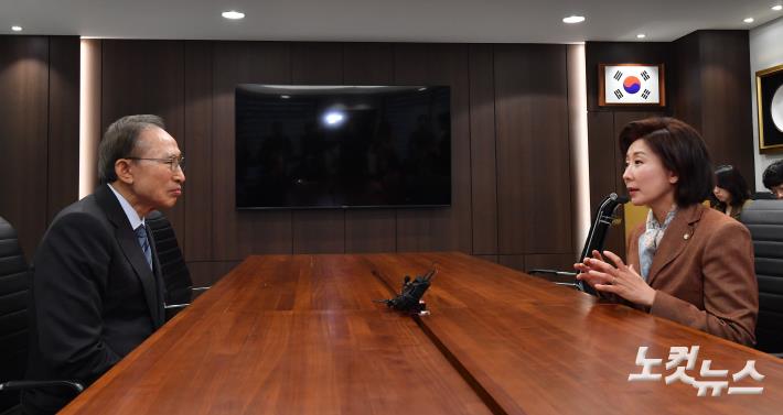대선 출마를 선언한 나경원 국민의힘 의원이 14일 오후 서울 서초구 이명박 재단을 찾아 이명박 전 대통령을 예방하고 있다.