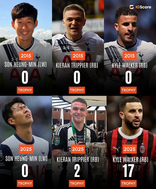 손흥민과 뛰었던 토트넘 선수들은 팀을 떠나 대부분 우승을 경험했다. 축구 매체 '이그스코어'는 손흥민이 10년 동안 토트넘에서 뛰면서 우승 0회를 기록할 동안 키어런 트리피어는 2회, 카일 워커는 17회 우승을 했다고 했다.