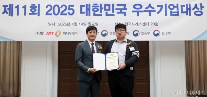 탁경만 탤런트링크 대표(사진 오른쪽)가 14일 오후 서울 중구 한국프레스센터에서 열린 머니투데이 주최의 '2025 제11회 대한민국 우수기업대상' 시상식에서 '글로벌 채용 플랫폼' 부문으로 '우수스타트업대상'을 수상한 뒤 송기용 머니투데이 전무와 기념 촬영 중이다.