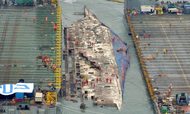 세월호가 침몰한 지 3년 만인 2017년 전남 진도군 동거차도 앞바다에서 중국 인양업체인 상하이샐비지의 재킹바지선 두 척이 세월호를 바닷속에서 끌어 올리고 있다. 진도=박경우 기자 |