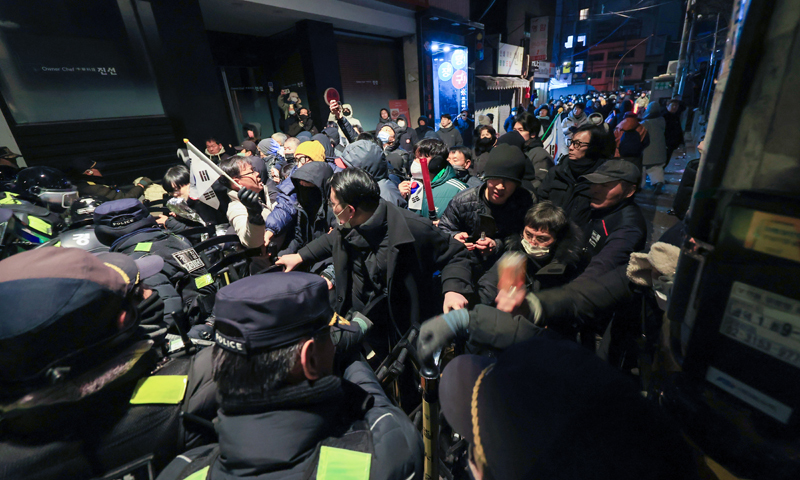 윤석열 대통령이 내란 우두머리 혐의로 구속되자 일부 지지자들이 서울 마포구 서울서부지방법원에 난입한 지난 1월 19일 서부지법 후문 인근에서 경찰이 시위 중인 윤 대통령 지지자들을 해산시키려고 하자 지지자들이 이를 막고 있다. 연합뉴스 |