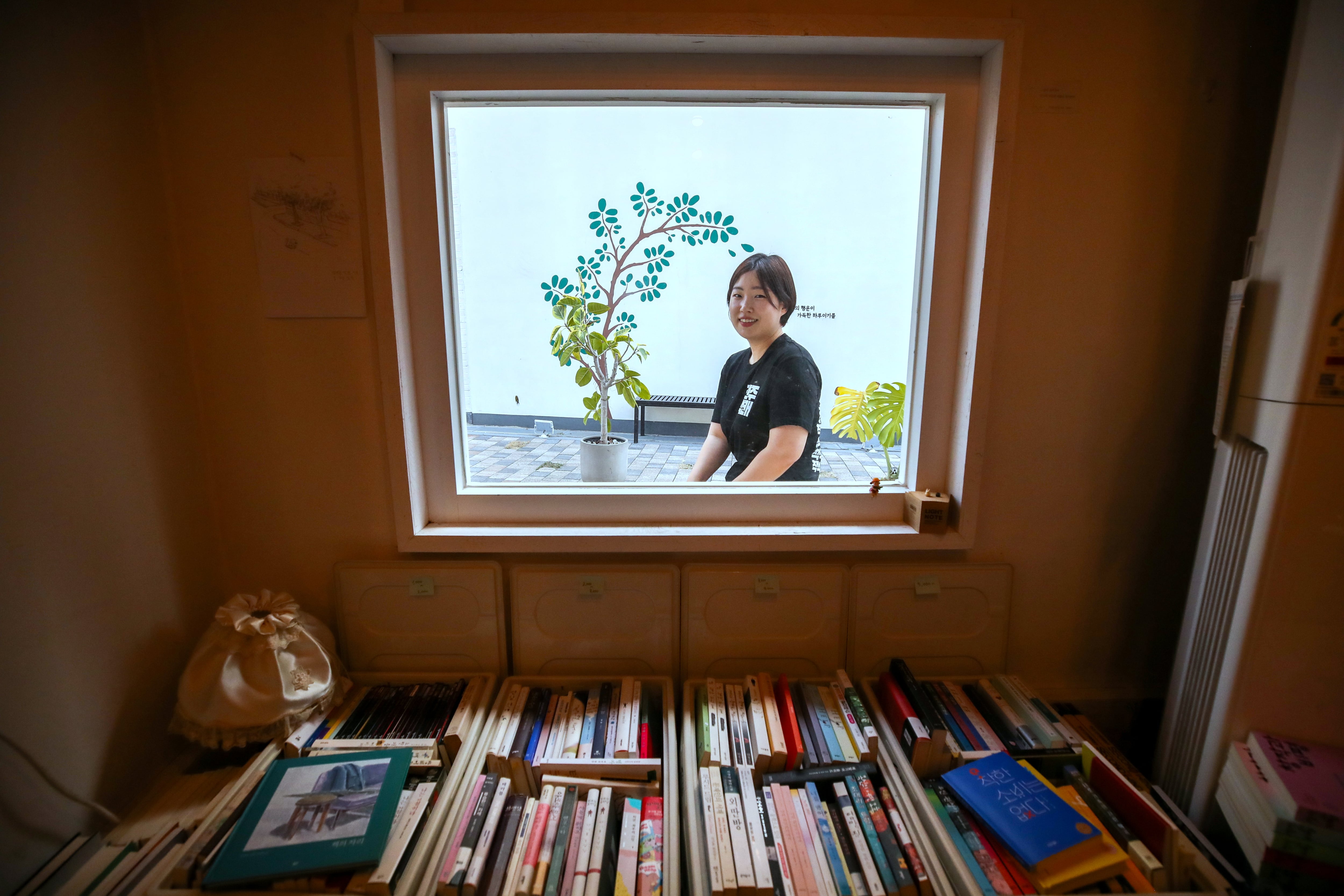 책방 안에서 작은 유리창을 통해 바깥을 바라본 모습. 책방 대표 임주아 시인이 포즈를 취했다. /김영근 기자 |