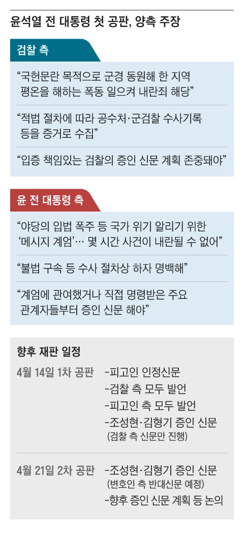 검찰과 윤 전 대통령 측 변호인은 약 6시간 동안 날 선 공방을 벌였다. 검찰 측은 120페이지 분량의 PPT를 띄워놓고 “피고인은 위헌·위법적인 포고령에 근거해 비상계엄을 대한민국 전역에 선포했다” “군경을 동원해 한 지역의 평온을 해하는 폭동을 일으켜 형법 제87조(내란)에 의하여 기소했다”고 주장했다.