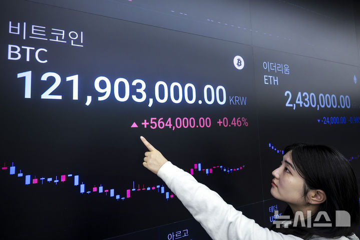 [서울=뉴시스] 정병혁 기자 = 10일 서울 강남구 업비트 고객센터 전광판에 비트코인 시세가 표시되고 있다. 미국이 우리나라를 포함해 일부 국가에 부과하기로 했던 상호관세를 90일 유예한다고 발표하면서 미국 증시와 함께 가상자산 가격이 전반적으로 상승세를 보이고 있다. 이날 오전 11시 기준 비트코인은 국내에서 1억2000만원대선에서 거래중이다. 2025.04.10. jhope@newsis.com |