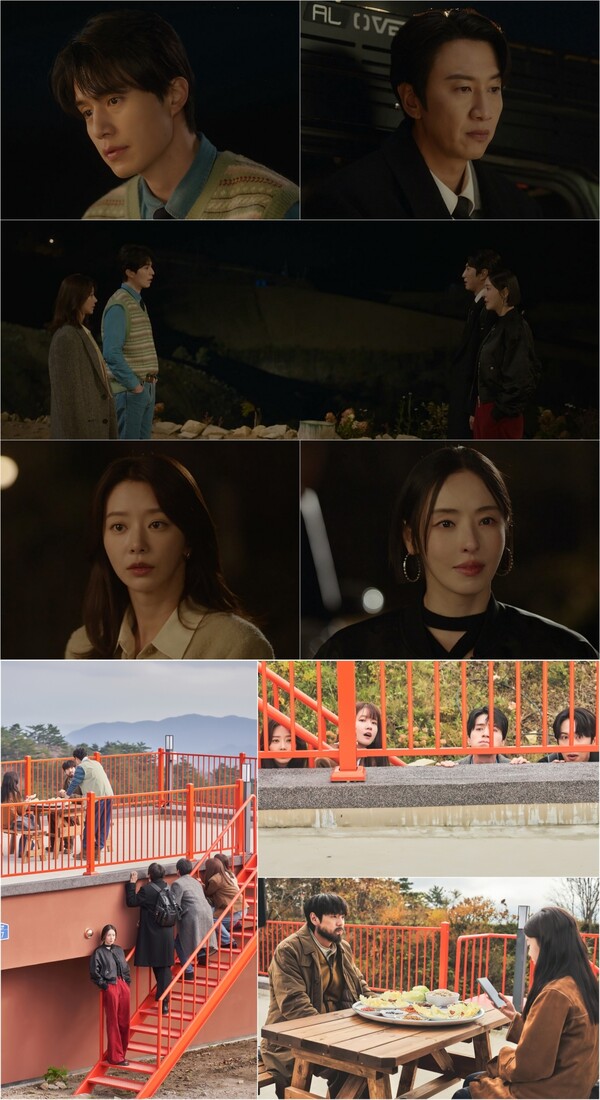 이혼보험을 둘러싼 예측 불가의 위기가 계속되는 가운데 TF팀의 관계에도 격변이 찾아온다. 공개된 사진 속 마을 어귀에서 마주한 노기준, 강한들, 안전만, 전나래 사이로 흐르는 미묘한 긴장감이 이목을 집중시킨다. 이번 사자대면은 각자 마음에 생긴 변화를 들여다보고 솔직해지는 계기가 된다고. 앞서 공개된 예고편에서 "전전전부인으로서 물어보는 건데 두 사람 무슨 사이야?"라는 전나래의 날카로운 질문이 호기심을 자극한 바, 네 사람 사이 오고 갈 대화가 더욱 궁금해진다.