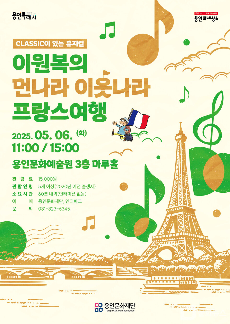 (문화뉴스 이미숙 기자) 용인문화재단은 다음 달 6일 대체공휴일에 어린이들을 위한 특별 공연 '클래식이 있는 뮤지컬 <이원복의 먼나라 이웃나라–프랑스 여행>' 을 용인문화예술원 마루홀에서 개최한다.