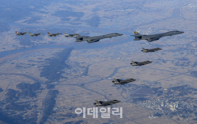 한미 연합공중훈련에서 미 B-1B 전략폭격기와 F-16 F-35A가 편대비행을 하고 있다. (사진=합참) |