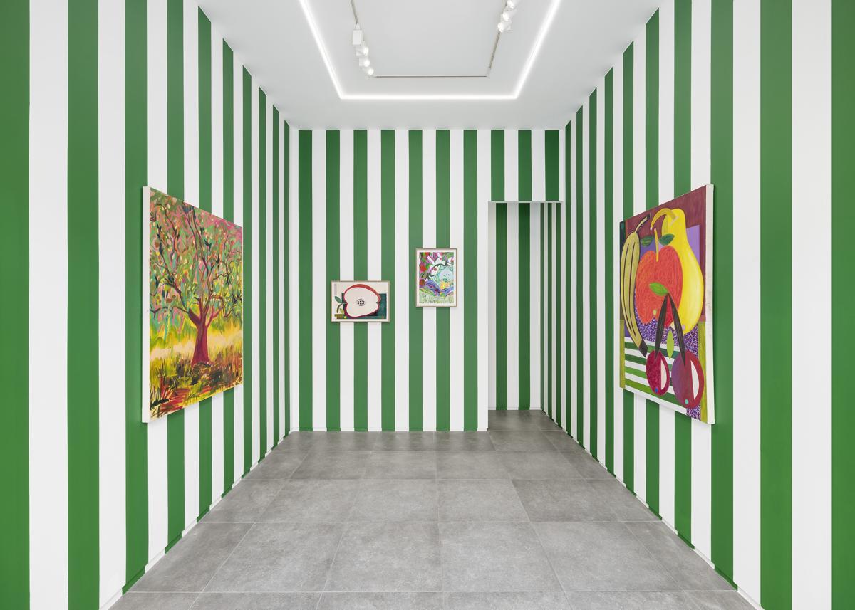 과일 정물과 자연 풍경을 그리는 두 작가는 전시장 벽을 녹색과 흰색 줄무늬로 칠하고 간판을 달았다. 9일 전시 공간에서 만난 두 작가는“프랑스 전통 과일 시장의 차양에서 볼 수 있는 색을 가져왔고, 과일 모양 간판도 달아 지나가는 누구나 편히 들어와 작품을 볼 수 있도록 했다”고 했다.