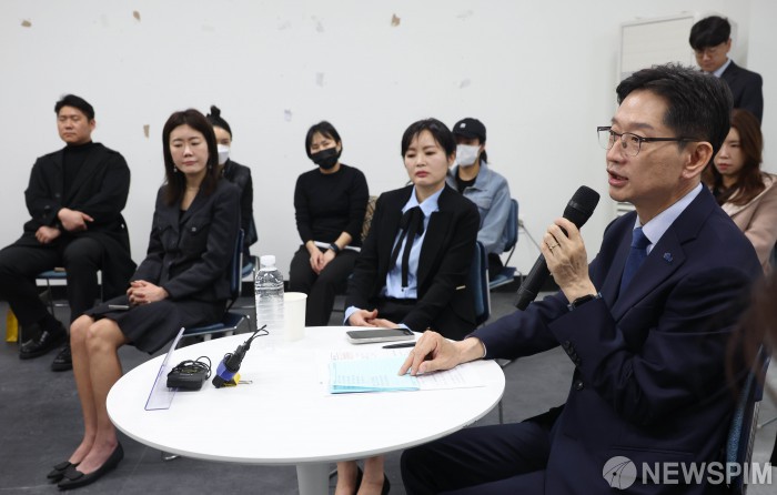 [고양=뉴스핌] 김학선 기자 = 더불어민주당 대선 경선에 출마한 김경수 전 경남지사가 15일 경기도 고양시의 한 공실 상가에서 열린 민생경제 회복을 위한 자영업자 간담회에서 인사말을 하고 있다. 2025.04.15 yooksa@newspim.com