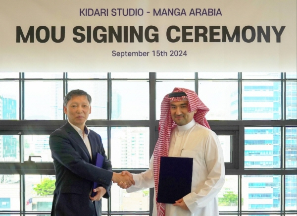 지난해 9월 15일 한국의 키다리 스튜디오 허흥범 대표와 사우디의 망가 아라비아 에삼 부카리 대표가 업무협약을 체결한 모습 |